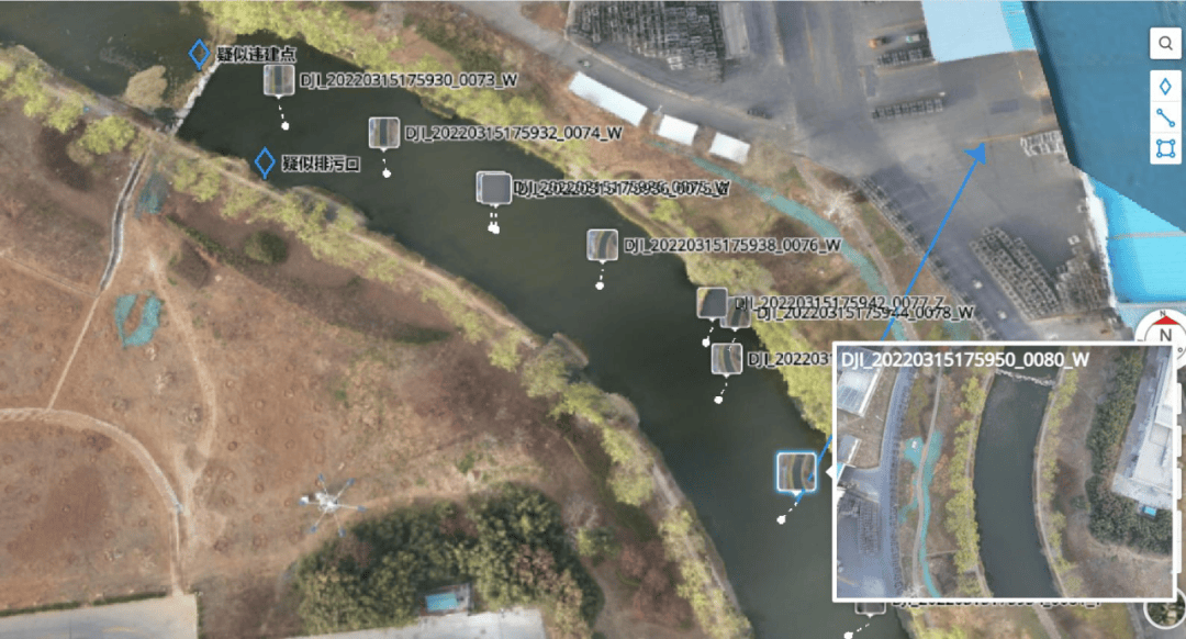 通过大疆经纬M30系列无人机,通过设定航线任务,沿河道巡察自动飞行,拍摄关键点信息。对重要区域生成数字影像,记录疑似排污、违建等信息。