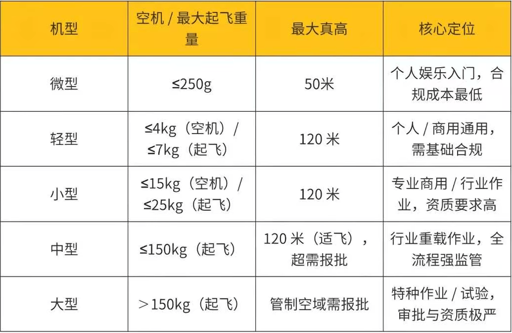 - 轻型:250克 < 空机重量 ≤ 4千克